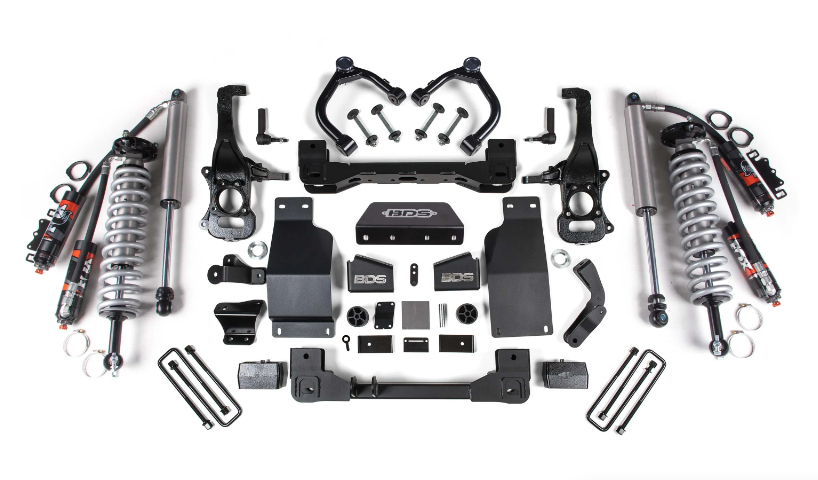 Elevate your suspension on your Chevy Silverado / GMC Sierra 1500 truck with the BDS Geomerty Corretion Lift kit 4" - 6" Option, featuring FOX 2.5 Performance Elite shocks. Designed to improve stance, performance, and capability, this kit includes everything necessary to set your truck up right.